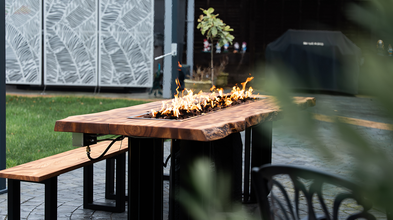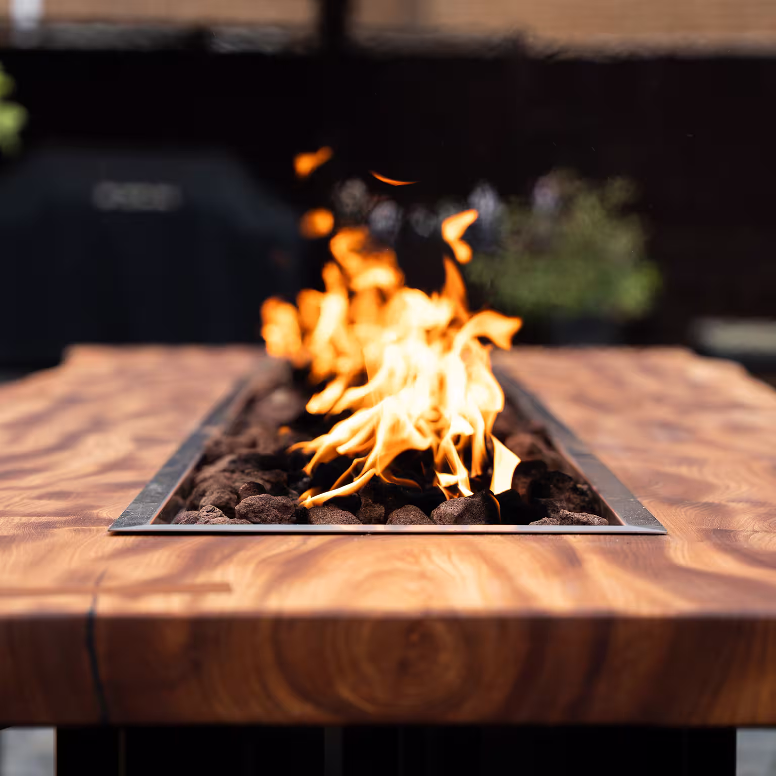 We designed bespoke steel leg frames that could support the weight of solid timber slabs while housing the gas systems safely. Every piece was hand-milled in our workshop, with the gas ignition systems custom-fitted to work seamlessly with the natural timber.