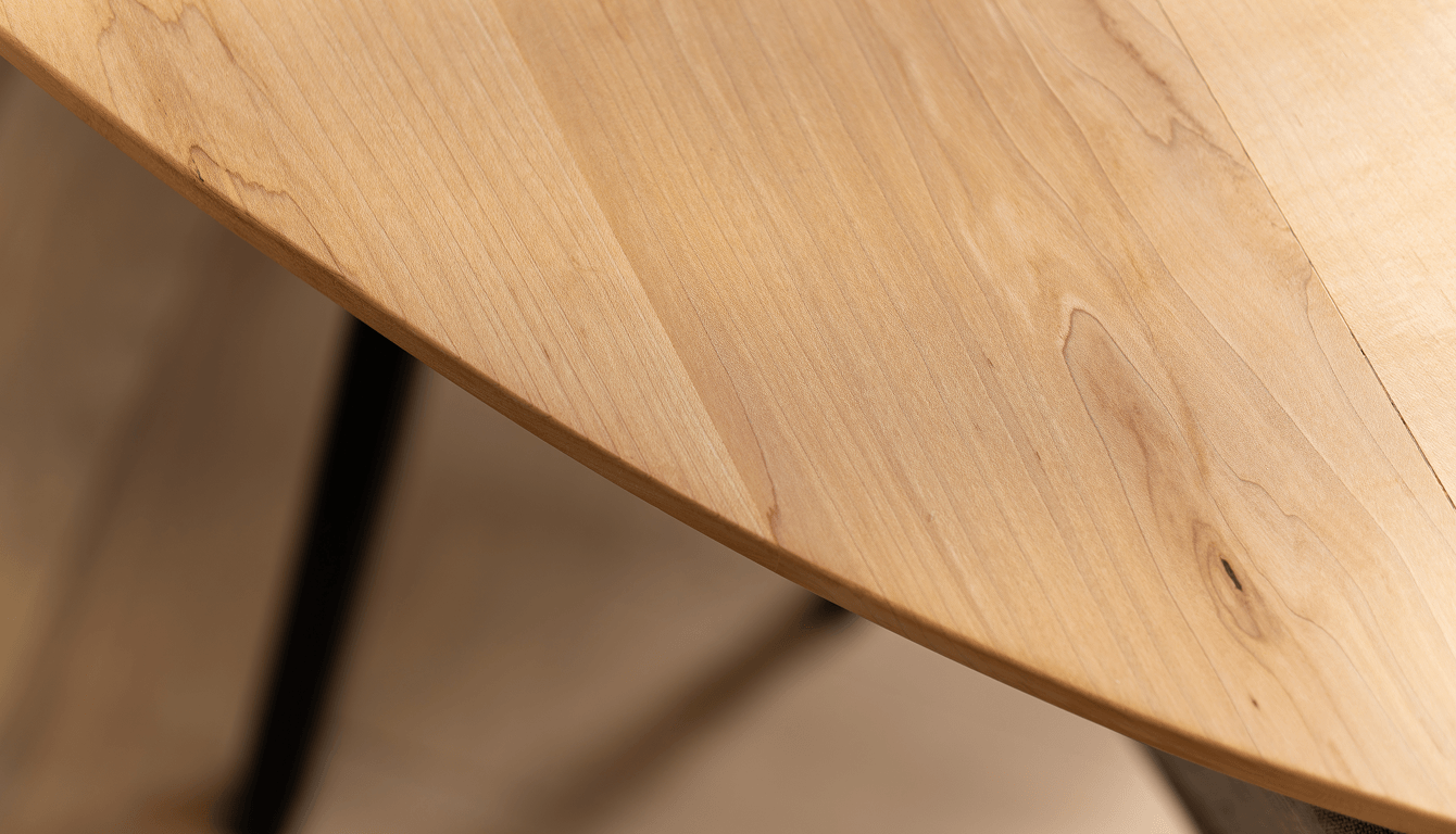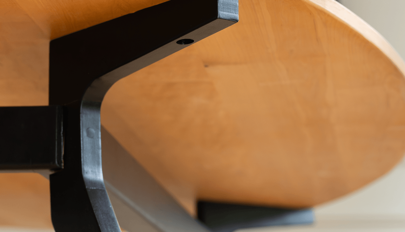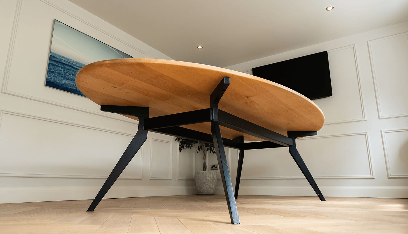 From there we built an oval dining table with a Maple top and a stained black Ash base, the contrast between the two doing the quiet work of making the piece feel considered without showing off. Thin steel-profile legs kept the silhouette exactly as they'd asked. Nothing interrupting the sitters, nothing cluttering the room.